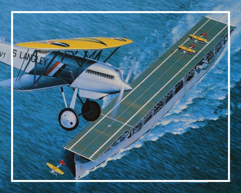 In 1920, the U.S. Navy converted a collier (a ship used to transport coal) into America's very first aircraft carrier - the USS Langley (CV 1). She was the only ship of her class and became an experimental platform for naval aviation pioneers. Nicknamed the "Covered Wagon" for her flush flight deck carried over a steel framework, the USS Langley served the Navy in numerous roles until sunk by the Japanese in 1942.