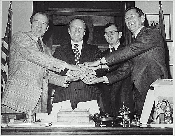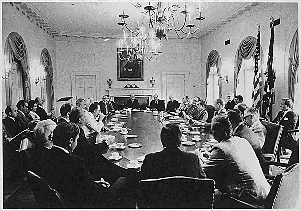 H0036-3. President Richard M. Nixon meets with Senate Minority Leader Hugh Scott, House Minority Leader Gerald R. Ford, and Representative John Rhodes in the Cabinet Room...Show moreH0036-3. President Richard M. Nixon meets with Senate Minority Leader Hugh Scott, House Minority Leader Gerald R. Ford, and Representative John Rhodes in the Cabinet Room. 1971. Show less