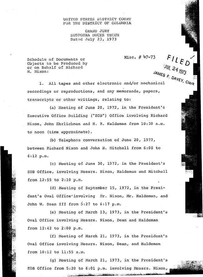 Citation: Grand Jury subpoena issued by Special Prosecutor Archibald Cox to President Richard Nixon on July 26, 1973, Misc. 47-73; United States District Court for the District of Columbia; Records of the District Courts of the United States, Record Group 21, NARA, College Park, MD.
