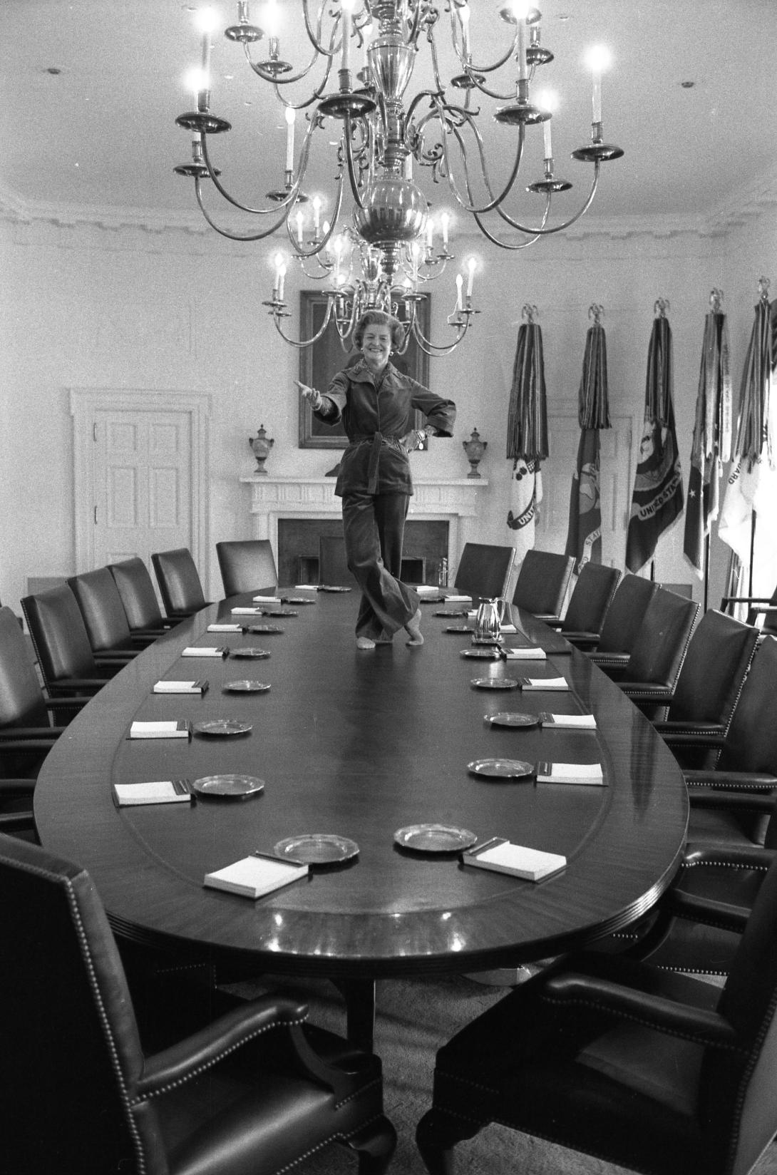 B2843-09A. First Lady Betty Ford dances on the Cabinet Room table on the day before departing the White House upon the inauguration of President Jimmy Carter. January 1...Show moreB2843-09A. First Lady Betty Ford dances on the Cabinet Room table on the day before departing the White House upon the inauguration of President Jimmy Carter. January 19, 1977. Show less