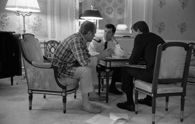 A2046-09A - President Ford, in his pajamas, meets with staff members Steve Todd (military aide) and Terry O'Donnell in the President's suite in the Akasaka Palace, Tokyo,...Show moreA2046-09A - President Ford, in his pajamas, meets with staff members Steve Todd (military aide) and Terry O'Donnell in the President's suite in the Akasaka Palace, Tokyo, Japan. November 19, 1974. Show less
